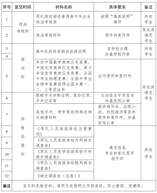 五、放棄政治考核。7月2日20時前,主動放棄政治考核的考生,由本人到政治考核所在地縣(市、區)人武部呈送書面申請,說明放棄理由、作出不反悔承諾,由本人和家長共同簽字,申請書背面復印考生和家長身份證,逾期影響其他高校錄取。放棄政治考核考生,不得參加面試和體檢。