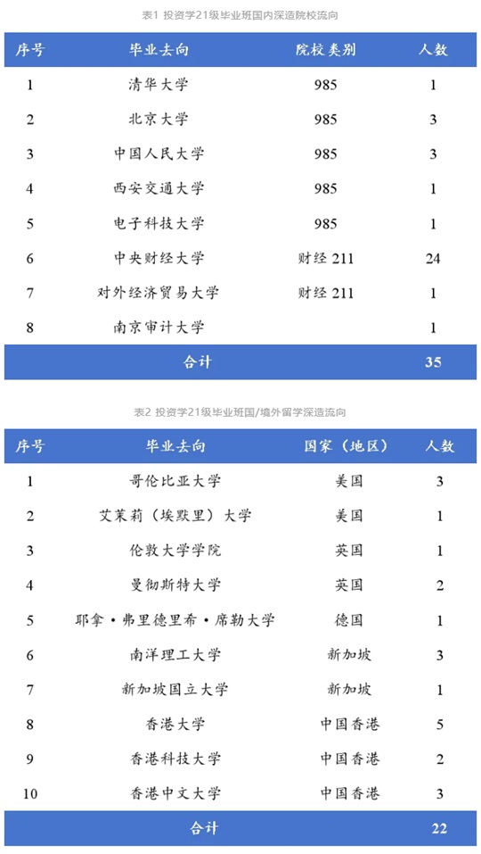 四度春秋磨礪,收獲累累碩果。中央財(cái)經(jīng)大學(xué)投資學(xué)專業(yè)2021級(jí)畢業(yè)班同學(xué)們銳意進(jìn)取、奮力拼搏,學(xué)習(xí)于課堂之上,鍛煉于實(shí)踐之間,積極擁抱數(shù)字創(chuàng)新、交叉融合的時(shí)代浪潮,踴躍踐行經(jīng)世濟(jì)民、財(cái)菁強(qiáng)國(guó)的青年使命,以優(yōu)異的成績(jī)與全面的成長(zhǎng),交出又一份畢業(yè)季亮眼答卷。截止目前,已有35位同學(xué)確定國(guó)內(nèi)升學(xué)深造,22位同學(xué)確定國(guó)/境外留學(xué)深造,畢業(yè)深造率為73.08%。國(guó)內(nèi)深造高校涵蓋了包括清華大學(xué)、北京大學(xué)、中國(guó)人民大學(xué)、西安交通大學(xué)、電子科技大學(xué)、中央財(cái)經(jīng)大學(xué)、對(duì)外經(jīng)濟(jì)貿(mào)易大學(xué)在內(nèi)的國(guó)內(nèi)知名高校(見表1);國(guó)/境外留學(xué)高校涵蓋了包括哥倫比亞大學(xué)、曼徹斯特大學(xué)、新加坡國(guó)立大學(xué)、南洋理工大學(xué)等在內(nèi)的國(guó)際知名高校(見表2)。