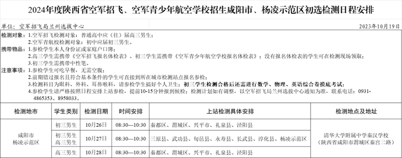 圖片根據年度空軍招飛招生工作安排,定于2023年10月26日至10月28日面向咸陽市和楊凌示范區開展的2024年度空軍招飛和空軍青少年航空學校招生初選檢測地點定為:陜西省西咸新區秦漢中學。符合報名條件的初三年級男生上站參檢報到時間為:2023年10月26日至10月27日每天10:30之前;符合報名條件的高三年級男生上站參檢報到時間為:2023年10月27日至10月28日每天10:30之前。各區縣符合報名條件的初三、高三年級男生上站參檢具體安排如下: