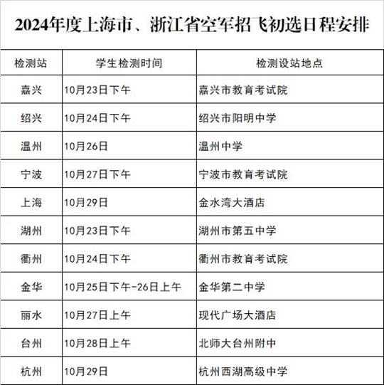根據2024年度空軍招飛工作安排,10月23日至10月29日,空軍招飛局南京選拔中心將派初選組赴各地市,對報考空軍飛行學員的學生進行檢測。