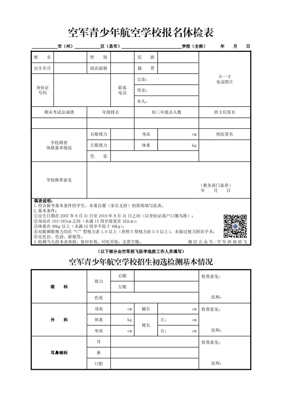 空軍青少年航空學(xué)校報名體檢表(初中生)