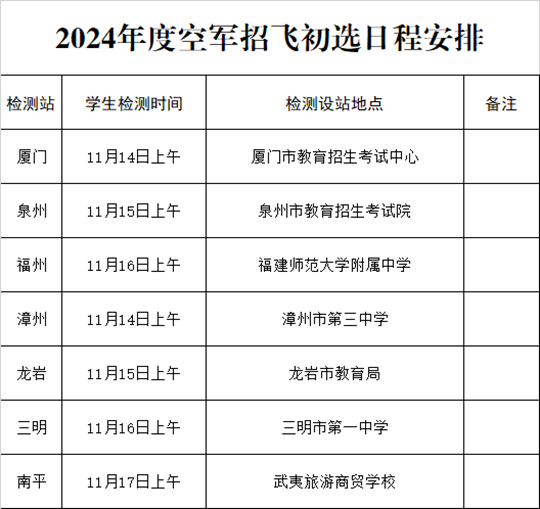 根據2024年度空軍招飛工作安排,11月14日至11月17日,空軍招飛局南京選拔中心將派初選組赴各地市,對報考空軍飛行學員的學生進行檢測。