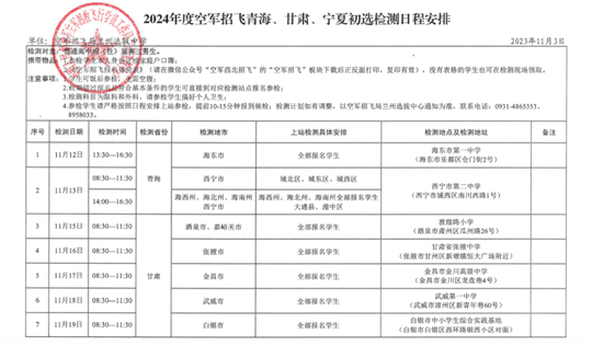 2.方法步驟:空軍招飛局蘭州選拔中心計劃在西寧市、海東市設置共2個初選檢測站,組織報名學生就近上站參檢。具體檢測時間和設站地點將根據我省報名學生分布情況,直接與相關教育考試招生機構對接協調。