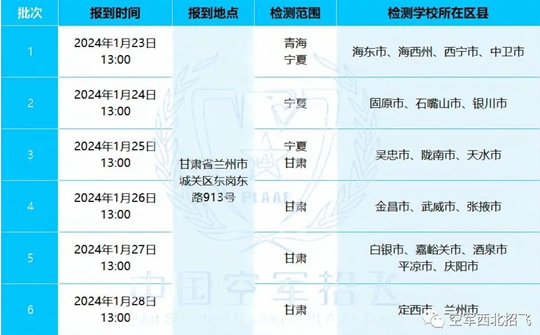 根據空軍年度招飛工作安排,2024年度空軍招飛甘肅、青海、寧夏復選檢測工作將于2024年1月23日-2024年1月28日展開。具體安排如下: