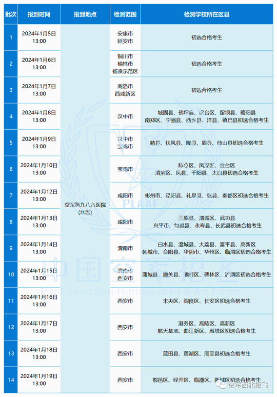 根據空軍年度招飛工作安排,2024年度空軍招飛陜西省復選檢測工作將于2024年1月5日-2024年1月19日開展。現將具體事項通知如下: