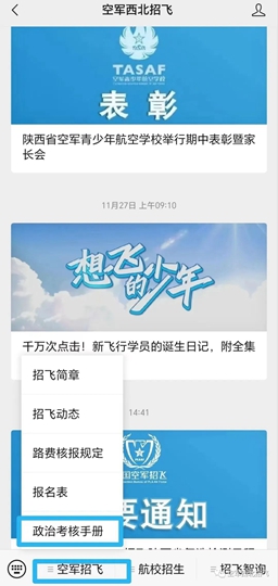★《空軍招收飛行學員政治考核線索表》和《空軍招收飛行學員政治考核手冊》紙質版、電子版(須完整填寫,電子版資料可用U盤保存攜帶),以及《手冊(填寫說明)》——“參加復選需攜帶資料清單”中明確的全部資料;(《線索表》和《手冊》可于“空軍西北招飛”公眾號下載打印)