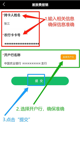 4.乘坐公共交通工具報到的,按軍校學員標準報銷往返路費。請務必保留好有效乘車票據,憑票報銷(火車報銷憑證為粉色或藍色紙質報銷憑證,不是行程信息提示單),乘坐飛機的按火車票核算,需提供行程單或發票(不是登機牌)。路費報銷僅支持農業銀行儲蓄卡轉賬,請登錄《空軍招飛綜合信息管理系統》個人賬戶,點擊“差旅費報銷”填寫農行儲蓄卡卡號、開戶人姓名、開戶行名稱等信息(為確保信息采集準確,請攜帶報銷用農行儲蓄卡和開戶人身份證復印件。如登錄后無“差旅費報銷”欄目,請直接刷新當前登錄頁面重新加載即可)。待我部審核后,通過銀行轉賬報銷。差旅費報銷信息填寫流程如下: