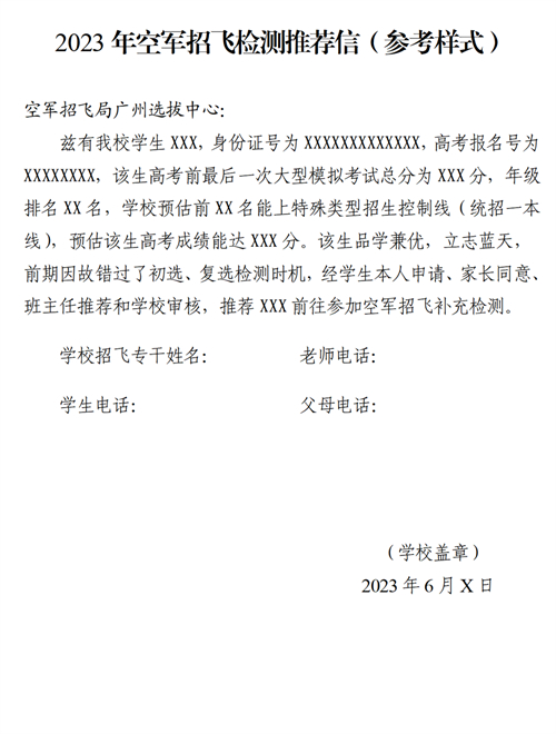 (五)暢通聯系。當前正處空軍招飛定選、投檔錄取的關鍵階段,請各位學生、家長保持電話暢通,防止誤時誤事。