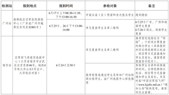 (三)其他事項。參加廣州站檢測學生均不安排食宿,隨到隨檢,檢完即可返回;參加南京站定選學生,報到后由空軍統一安排食宿。南京定選站不接待帶隊老師,陪同學生參檢的學生家長往返交通食宿費用自理。