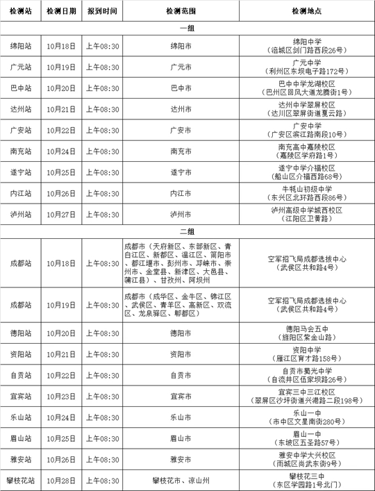 檢測安排如有變化,以空軍招飛局成都選拔中心通知為準。聯系電話:028-85399171。