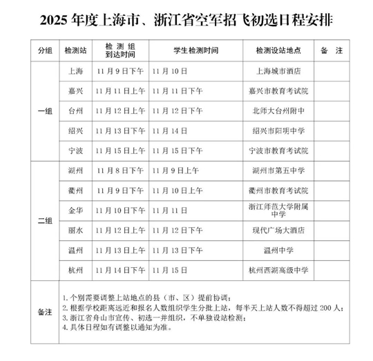 根據2025年度空軍招飛工作安排,11月9日至11月15日,空軍招飛局南京選拔中心將派初選組赴上海市、浙江省等地,對報考空軍飛行學員的學生進行檢測。