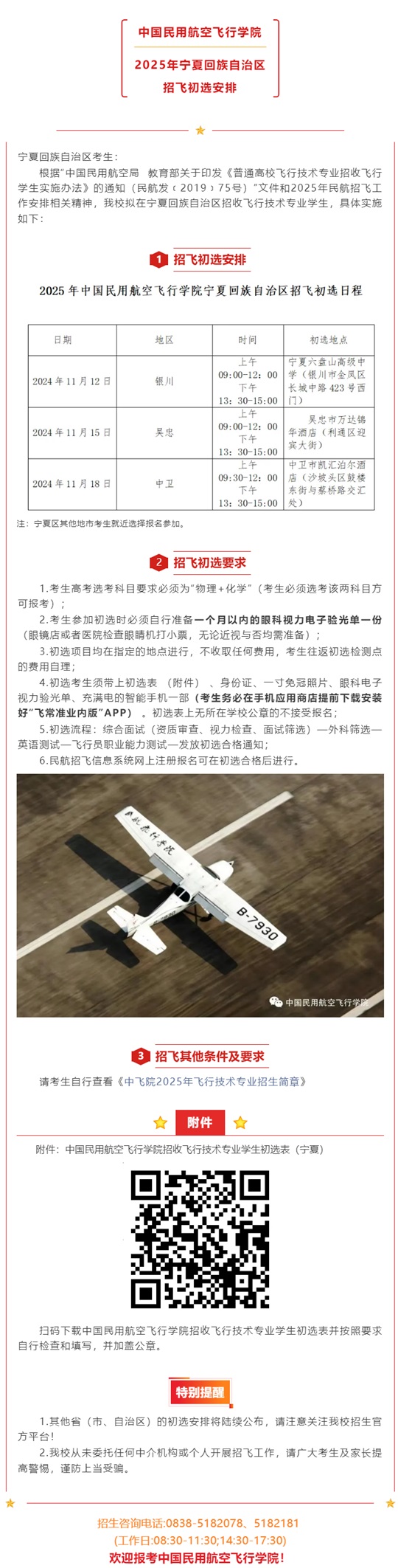 中國民用航空飛行學院2025年寧夏回族自治區招飛初選安排