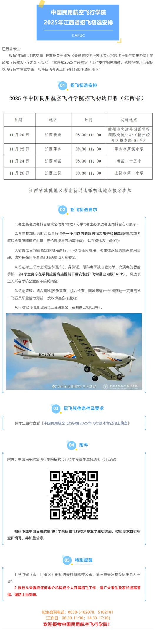 中國民用航空飛行學(xué)院2025年江西省招飛初選安排