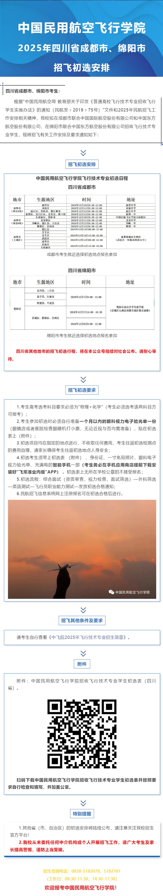 中國民用航空飛行學院2025年四川省成都市、綿陽市招飛初選安排