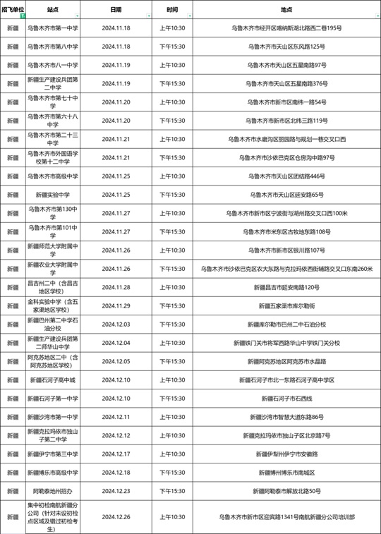 中國南方航空股份有限公司聯合北京航空航天大學、中國民用航空飛行學院在新疆開展校企合作招飛,現面向參加2025年全國統一高考的新疆高中畢業生招收飛行學員。初檢安排如下: