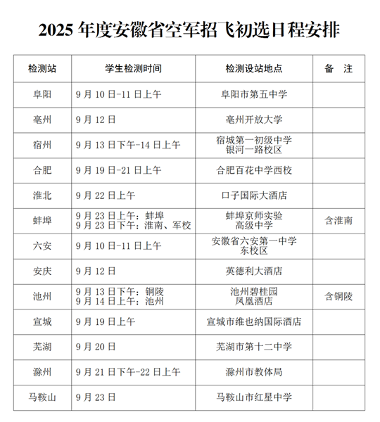 根據(jù)2025年度空軍招飛工作安排,9月10日至9月23日,空軍招飛局南京選拔中心將派初選組赴各地市,對報考空軍飛行學員的學生進行檢測。