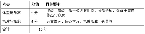 依據考生的五官、身材比例、腿形、肩形、體態進行評分。根據目測的具體情況進行評分。