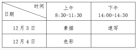 美術(shù)與設(shè)計(jì)類專業(yè)省統(tǒng)考安排在2022年12月3日-4日進(jìn)行,各科目考試時(shí)間具體安排如下: