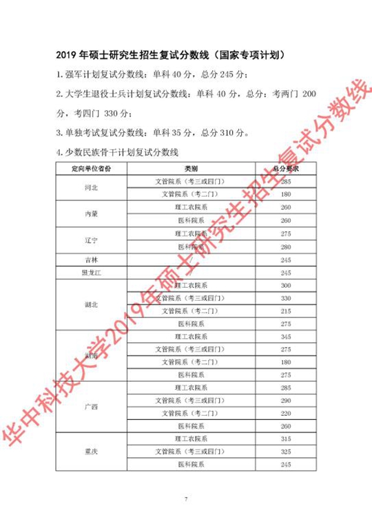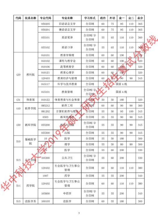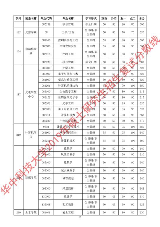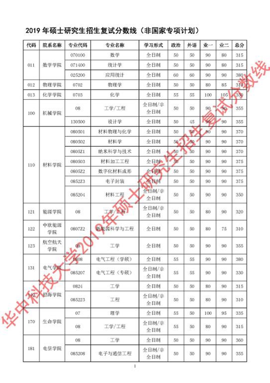華中科技大學(xué)2019年碩士研究生招生復(fù)試分?jǐn)?shù)線