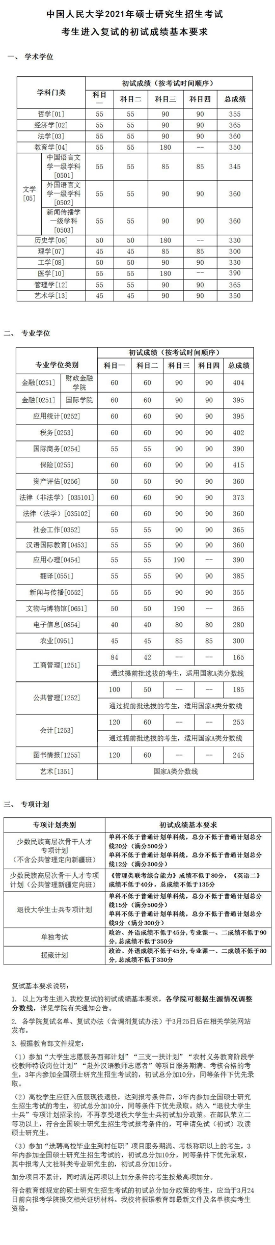 中國人民大學2021年碩士研究生招生考試考生進入復試的初試成績基本要求