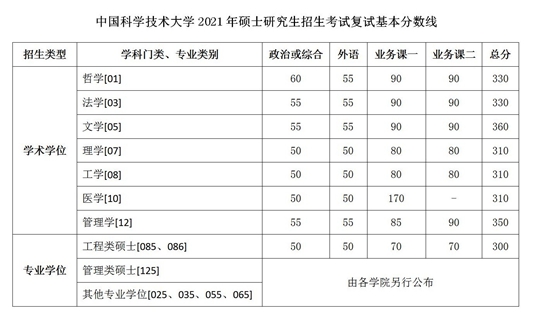 | 中國科學技術大學2021年碩士研究生招生考試復試基本分數線 |