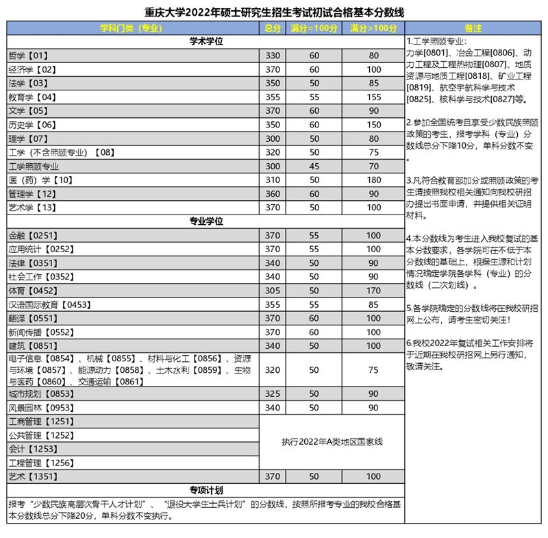 | 重慶大學(xué)2022年碩士研究生招生考試初試合格基本分?jǐn)?shù)線 |