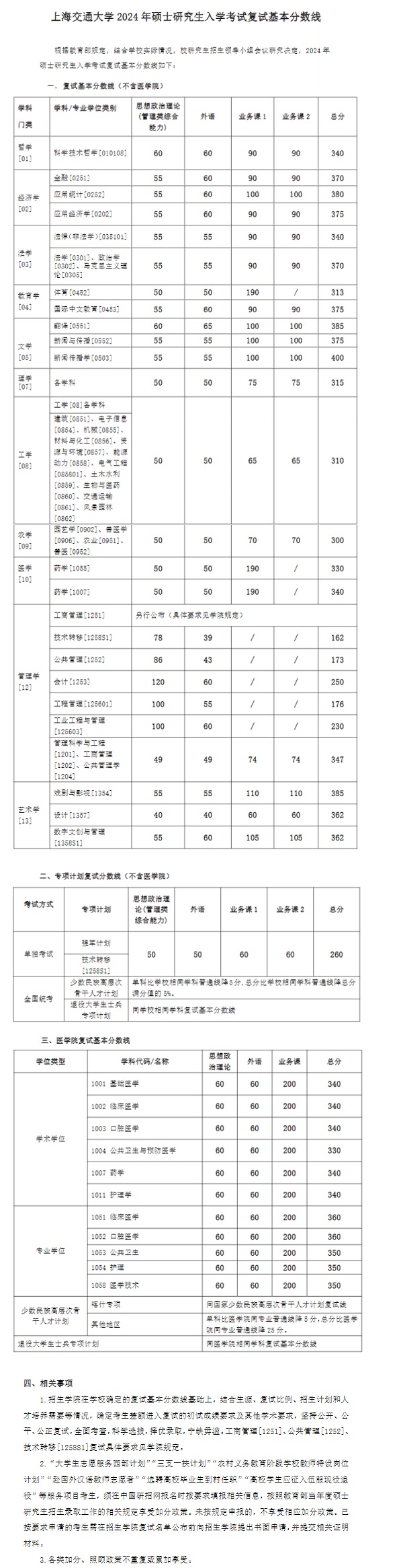 上海交通大學2024年碩士研究生入學考試復試基本分數線