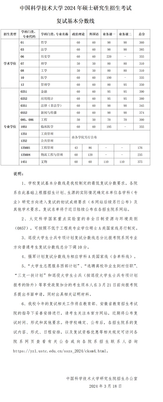 中國科學技術(shù)大學2024年碩士研究生招生考試復試基本分數(shù)線