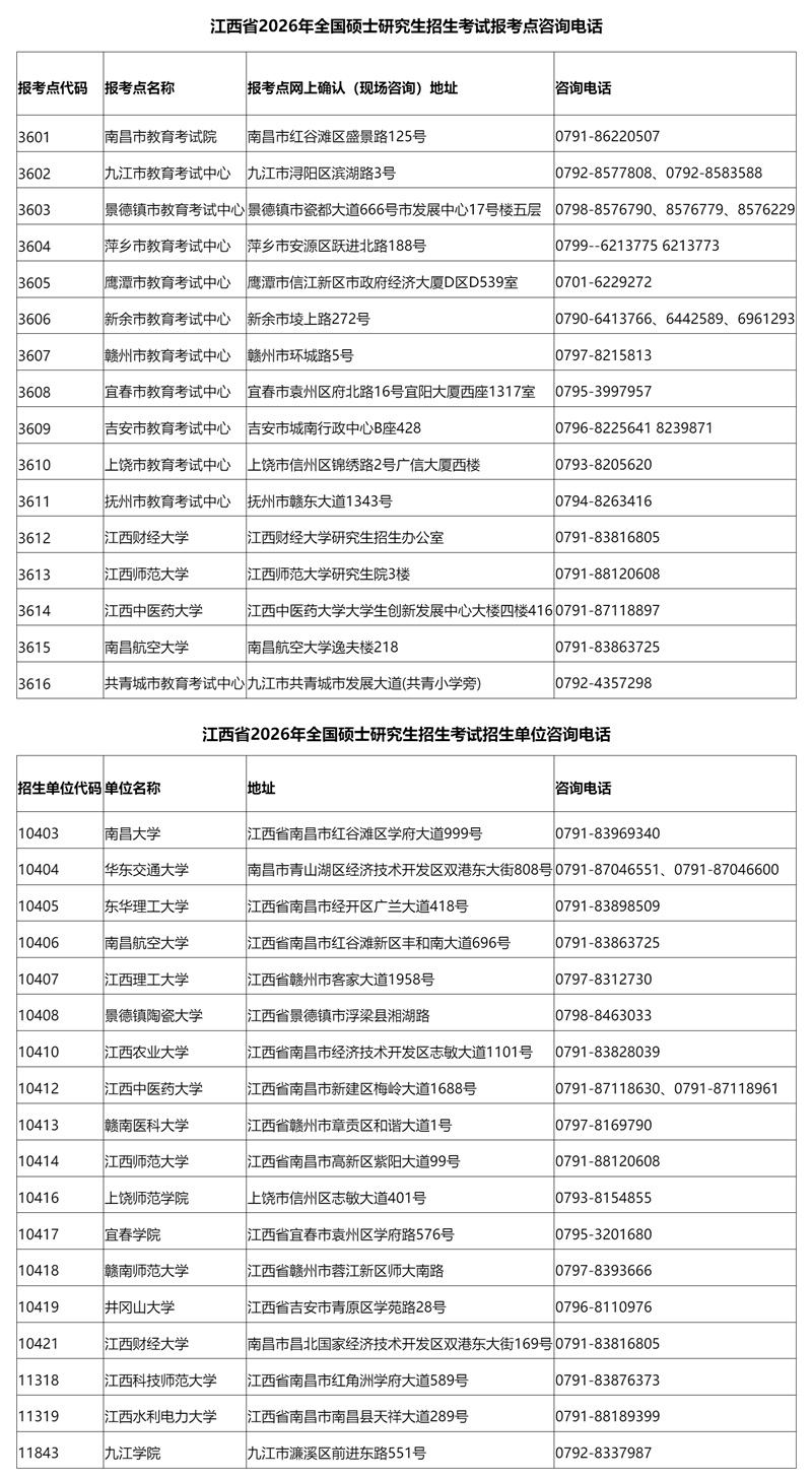 江西省2026年全國碩士研究生招生考試報考點和招生單位咨詢電話