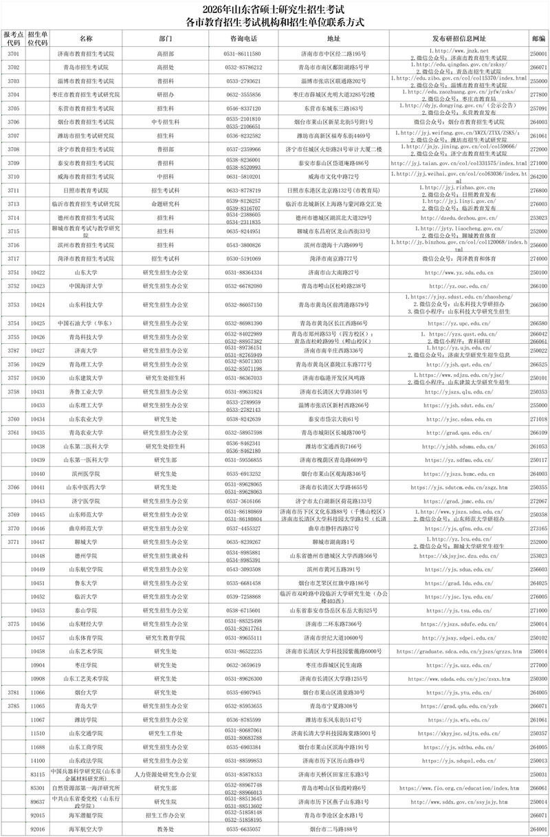 2026年山東省碩士研究生招生考試各市教育招生考試機構及招生單位聯系方式
