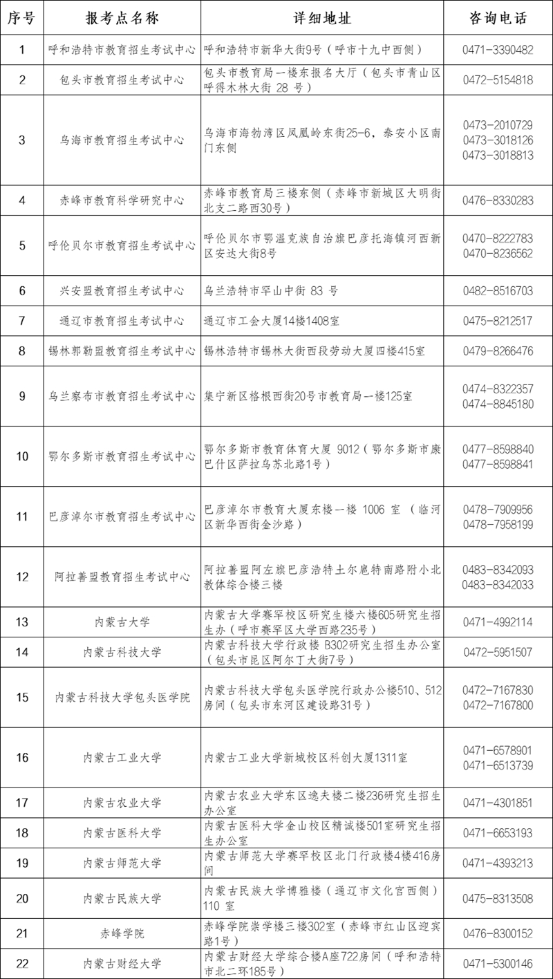 | 2026年全國(guó)碩士研究生招生考試內(nèi)蒙古自治區(qū)報(bào)考點(diǎn)名稱、地址、咨詢電話 |