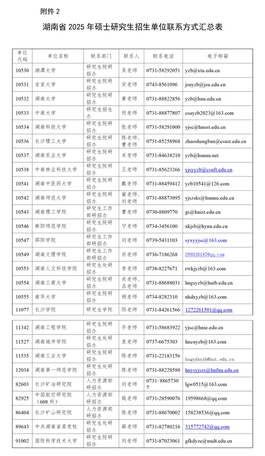 2.申請方式:考生如實填寫《湖南省2025年碩士研究生招生初試成績復核申請表》(見附件1),簽字確認后拍照,與本人身份證照片一并作為附件,通過電子郵件的方式發送到有關招生單位(見附件2)。成績復核結果可在3月7日后向報考的招生單位查詢。