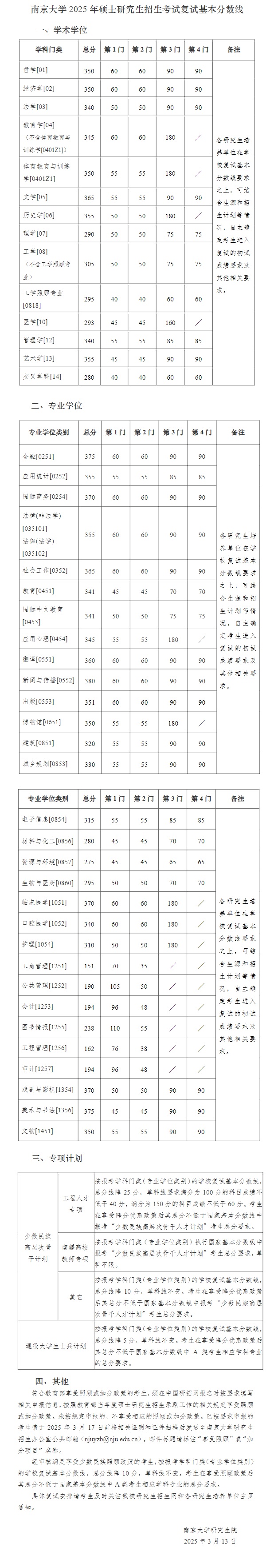 南京大學2025年碩士研究生招生考試復試基本分數線