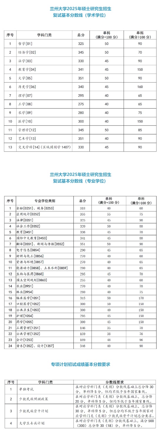 | 蘭州大學(xué)2025年碩士研究生招生復(fù)試基本分?jǐn)?shù)線 |