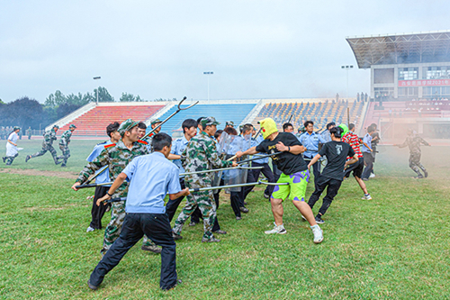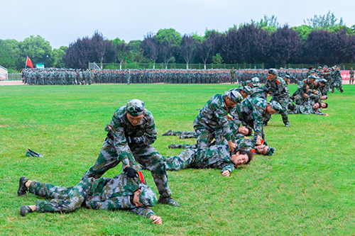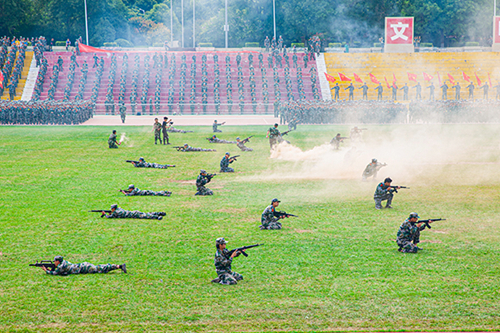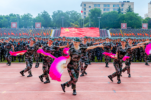 匯報(bào)表演環(huán)節(jié),隊(duì)列展示、擒敵拳、戰(zhàn)術(shù)、花樣隊(duì)列等科目依次登場。隊(duì)列展示方隊(duì)以整齊劃一的步伐展現(xiàn)了優(yōu)秀的單兵素質(zhì),健壯有力的臂膀仿似鐵鑄,緊緊焊死在鋼槍上。擒敵拳方隊(duì)動(dòng)作鏗鏘,威風(fēng)凜凜彰顯了威武不屈的氣勢。戰(zhàn)術(shù)方隊(duì)動(dòng)作整齊、剛勁有力,體現(xiàn)了學(xué)兵們鋼鐵一般的意志。花樣隊(duì)列的3000余名學(xué)兵手持紅黃紙,在教官的哨聲下,方陣迅速變化,學(xué)兵們以整齊的步伐搭配手語操和舞蹈的柔美,為慶祝建黨100周年獻(xiàn)上最真摯的祝福。通過一系列戰(zhàn)術(shù)動(dòng)作表演,展現(xiàn)出思源學(xué)子颯爽風(fēng)姿。