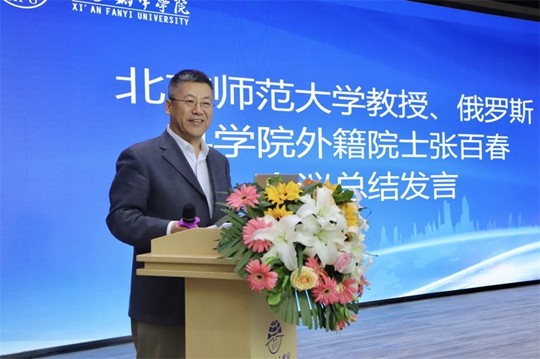 張百春在研討會的總結發言中回顧了自身經歷。他通過俄語的學習過程了解了俄羅斯哲學,再從俄羅斯哲學里找到了人生的所需、所想,包括對文學的認知。他寄語到場學子:語言的學習就是一場修行,選擇俄語語種進行學習是非常不錯的選擇,希望同學們通過借助學習俄語的機會,探索人生的更多可能。