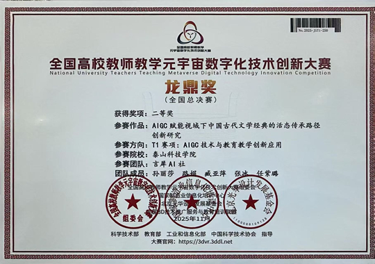 近日,第六屆全國高校教師教學元宇宙數字化技術創新大賽全國總決賽圓滿落幕。泰山科技學院孫麗莎老師帶隊的言犀AI社團隊,憑借作品《AIGC賦能視域下中國古代文學經典的活態傳承路徑》,在T1賽項“AIGC技術與教育教學創新應用”賽道中表現突出,成功斬獲全國總決賽二等獎。