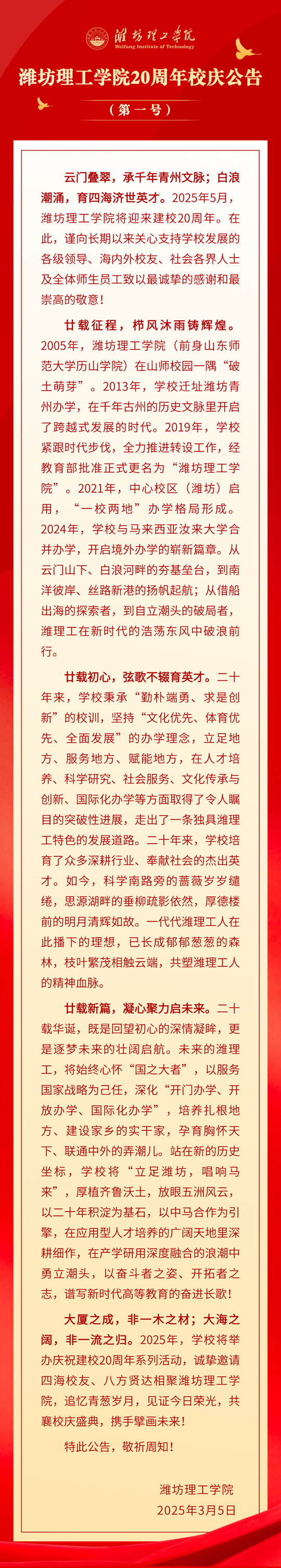 濰坊理工學院20周年校慶公告(第一號)