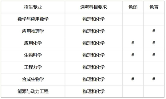 我校招生專業(yè)包括數(shù)學(xué)與應(yīng)用數(shù)學(xué)、應(yīng)用物理學(xué)、應(yīng)用化學(xué)、生物科學(xué)、工程力學(xué)、合成生物學(xué)、能源與動力工程。所有招生專業(yè)在非高考改革省份招收理科考生,在高考改革省份選考科目要求見下表: