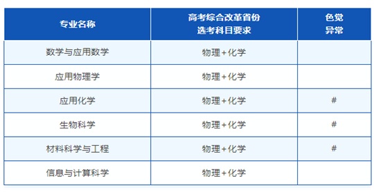 2.對考生身體健康狀況的要求執行教育部、原衛生部、中國殘疾人聯合會制定并下發的《普通高等學校招生體檢工作指導意見》中的規定。標記“#”的專業不招收相關色覺異常(色盲、色弱、單色不能識別)考生。