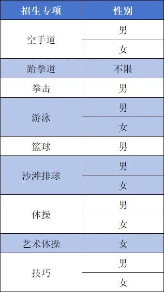 (五)我校依據梯次順序,優先錄取一志愿,未完成招生計劃的項目,再錄取二志愿。二志愿錄取期間進行計劃調整:同項目內男女間生源不均衡,優先在該項目中相互調整。其余仍未完成招生計劃的項目,剩余計劃按如下順序調整:籃球項目→沙灘排球項目→空手道項目→跆拳道項目→游泳項目→拳擊項目→體操項目→藝術體操項目→技巧項目。