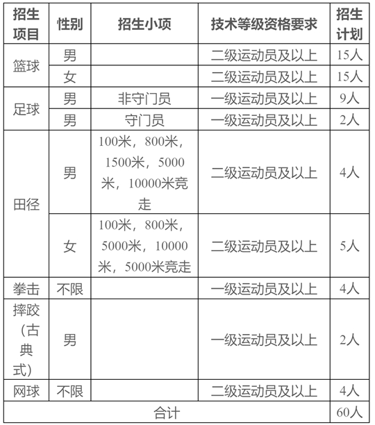 注:以上各招生項目最終錄取人數將視生源情況確定,學?蓪φ猩媱澾M行項目間調整;@球項目考生使用五人或三人籃球運動員技術等級證書均可報名,按照籃球項目考試方法與評分標準參加籃球專項測試。