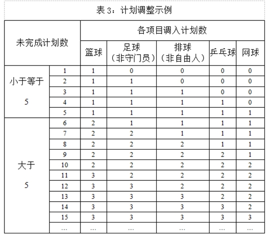 以單個計劃數的形式,按照籃球、足球(非守門員)、排球(非自由人)、乒乓球、網球的順序,按照輪次依次調入五個項目(無生源的項目輪空),以此類推,調完為止。例(見表3):