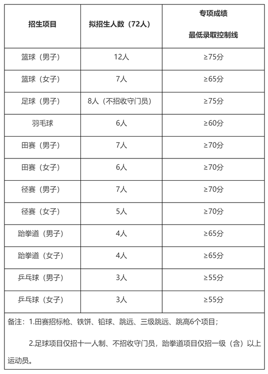 招生項目:籃球、足球(十一人制)、羽毛球、田徑、跆拳道、乒乓球。具體招生計劃見下表:
