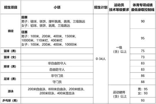 1.我校文化成績(jī)錄取控制線為180分。對(duì)持有一級(jí)運(yùn)動(dòng)員技術(shù)等級(jí)證書(shū)的考生,可在我校文化成績(jī)最低錄取控制線下降低30分錄取;對(duì)持有運(yùn)動(dòng)健將技術(shù)等級(jí)證書(shū)的考生,可在我校文化成績(jī)最低錄取控制線下降低50分錄取。體育專(zhuān)項(xiàng)成績(jī)錄取控制線詳見(jiàn)招生項(xiàng)目和計(jì)劃表。未達(dá)到上述要求的考生,不予錄取。