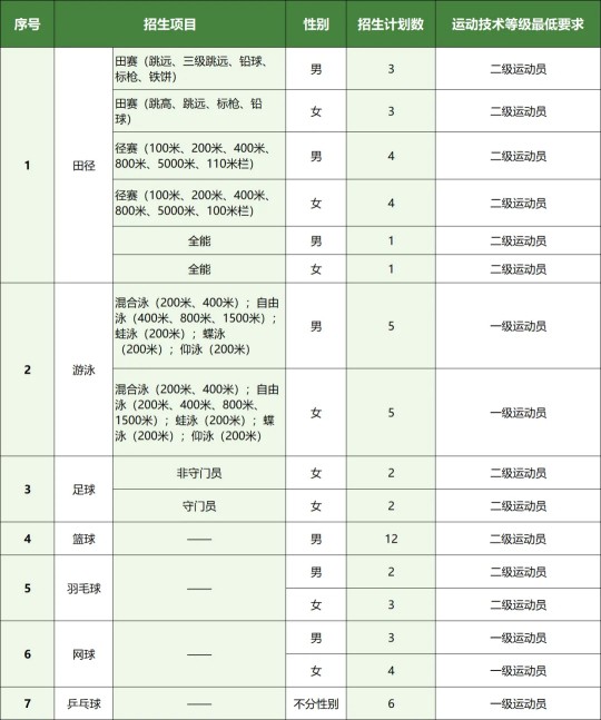 第十條 招生計劃總數 我校招生項目包括:籃球、足球、田徑(田賽、徑賽、全能)、羽毛球、網球、乒乓球、游泳。招生計劃總數為60名,按照上級部門規定,各項目最終招生人數視我校生源實際情況和項目需求而定。各項目具體要求如下: