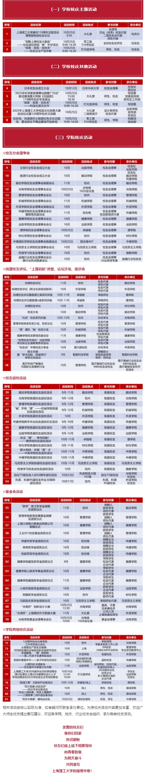 2025年10月25日,上海理工大學將迎來119周年校慶日。為進一步聯絡校友感情、增強校友活力、凝聚校友力量、傳承校友文化,更好地服務校友成長,建設“上理校友大家庭”,學校定于2025年10月25日(星期六)舉辦上海理工大學建校119周年校慶系列活動,誠摯邀請廣大校友重拾母校記憶、共祝母校生日,暢談合作、再敘深情。