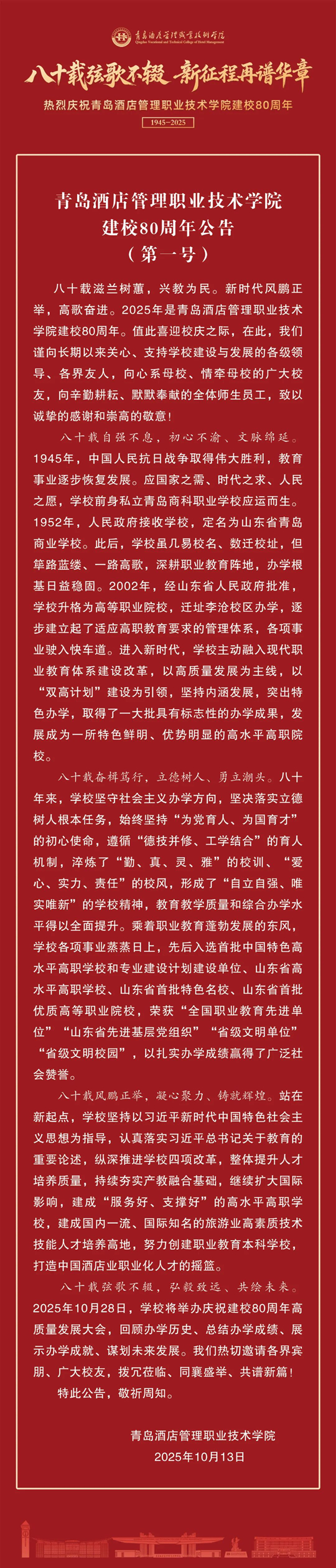 青島酒店管理職業技術學院建校80周年公告(第一號)