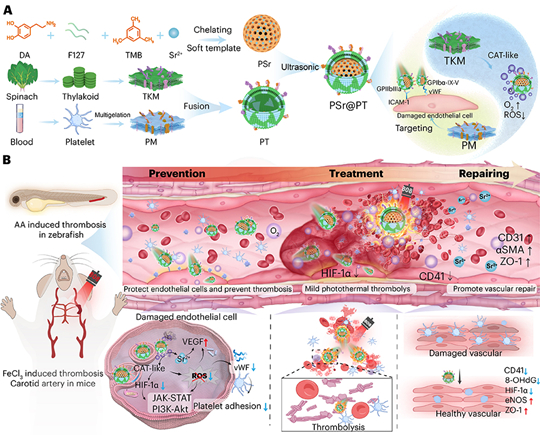 針對以上問題,研究團隊成功研發了一種以病理微環境驅動為核心的納米馬達系統(PSr@PT NPs),該系統的核心由摻鍶離子(Sr2+)的介孔聚多巴胺納米顆粒(PSr NPs)構成,它既作為納米馬達的主體,也是氧化應激觸發下釋放Sr2+的儲存庫,同時還能清除活性氧。為了實現雙重靶向推進,在PSr NPs表面整合一層由血小板膜(PM)和菠菜來源類囊體膜(TKM)組成的雜化膜。基于血小板膜的靶向性與類囊體膜的類過氧化氫酶活性,該結構能精準抵達血栓部位,并將H2O2分解為O2以驅動納米馬達自主運動,最終通過抑制炎癥與氧化應激來減輕血小板-內皮粘附。在近紅外(NIR)光照下,PSr NPs產生溫和的光熱效應(約40℃),通過直接熱溶栓及增強納米馬達滲透實現雙重溶栓效果。與此同時,從PSr NPs中可控的Sr2+釋放可促進內皮再生與屏障修復,從而阻斷血栓復發的惡性循環。該納米系統在多種跨物種模型中均展現出普適性溶栓功效,包括斑馬魚花生四烯酸誘導的血栓模型和小鼠三氯化鐵誘導的頸動脈栓塞模型。通過將植物光合膜的催化功能與哺乳動物系統的靶向精準性相結合,這種跨物種協同作用開創了仿生納米技術的新范式。該仿生結構將生物信號傳導(血小板-內皮識別)與物理刺激響應(光熱驅動)有機融合,從而在促進深層血栓滲透的同時重塑微環境。這一多維度治療策略將“瞬時溶栓”升級為“可持續血管功能恢復”,為精準抗血栓治療提供了一個具有轉化潛力的納米平臺。