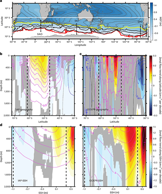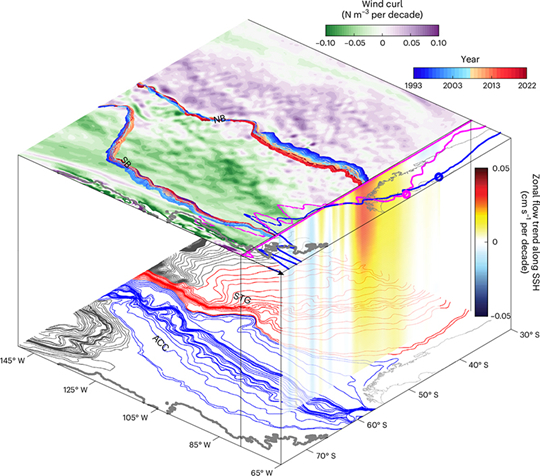 Drake Passage maintains a stable circumpolar transport”(德雷克海峽上游南極繞極流南移維持其環南極流量穩定)的最新研究成果。該研究揭示,在最近30年全球變暖背景下,南大洋雖然因南北增暖不均造成其北部的緯向流加速,但是南極繞極流的北邊界也發生了南移,使得增強的流動被分流至亞熱帶的南大洋超級環流,從而維持了南極繞極流在其整個流域中的流量穩定。